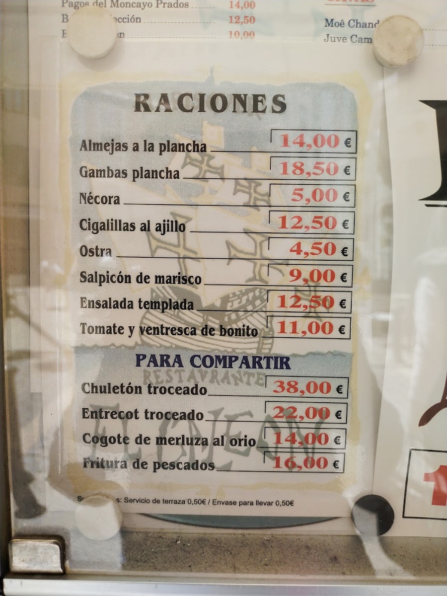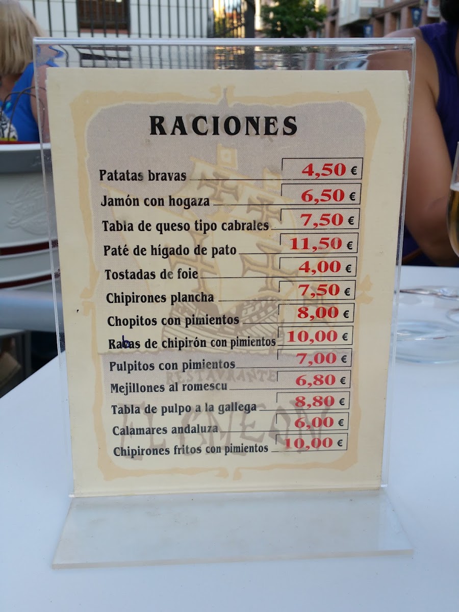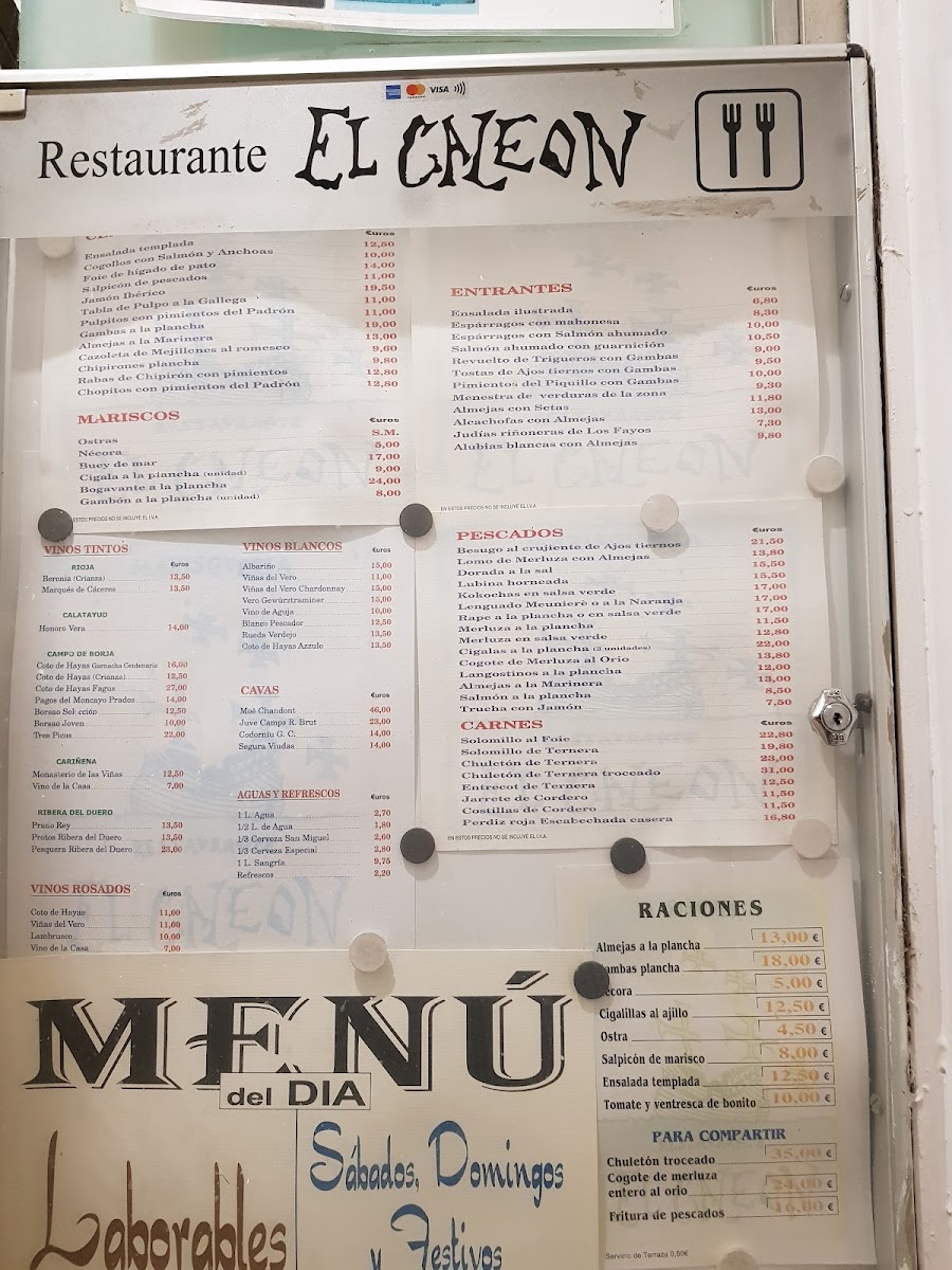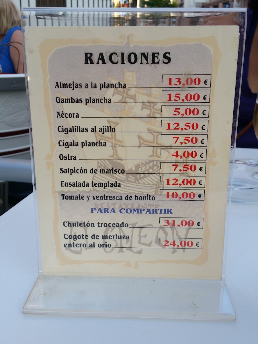The menu is structured to include several categories such as seafood specialties, grilled meats, traditional tapas, and desserts. Seafood options feature dishes like pulpo a la gallega, calamares en su tinta, chipirones a la plancha, paella de mariscos, and various fried fish preparations. Meat selections include items such as entrecot, chuletón, corzo guisado, costillas de cerdo, and codillo asado. Tapas provide lighter options suitable for casual dining or sharing.